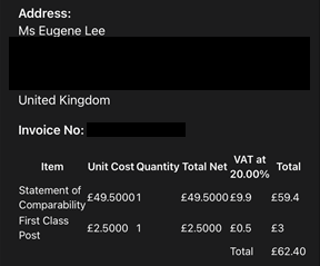 서류 자체는 59.4 파운드고, Post는 3파운드, 총 62.4 파운드였습니다.