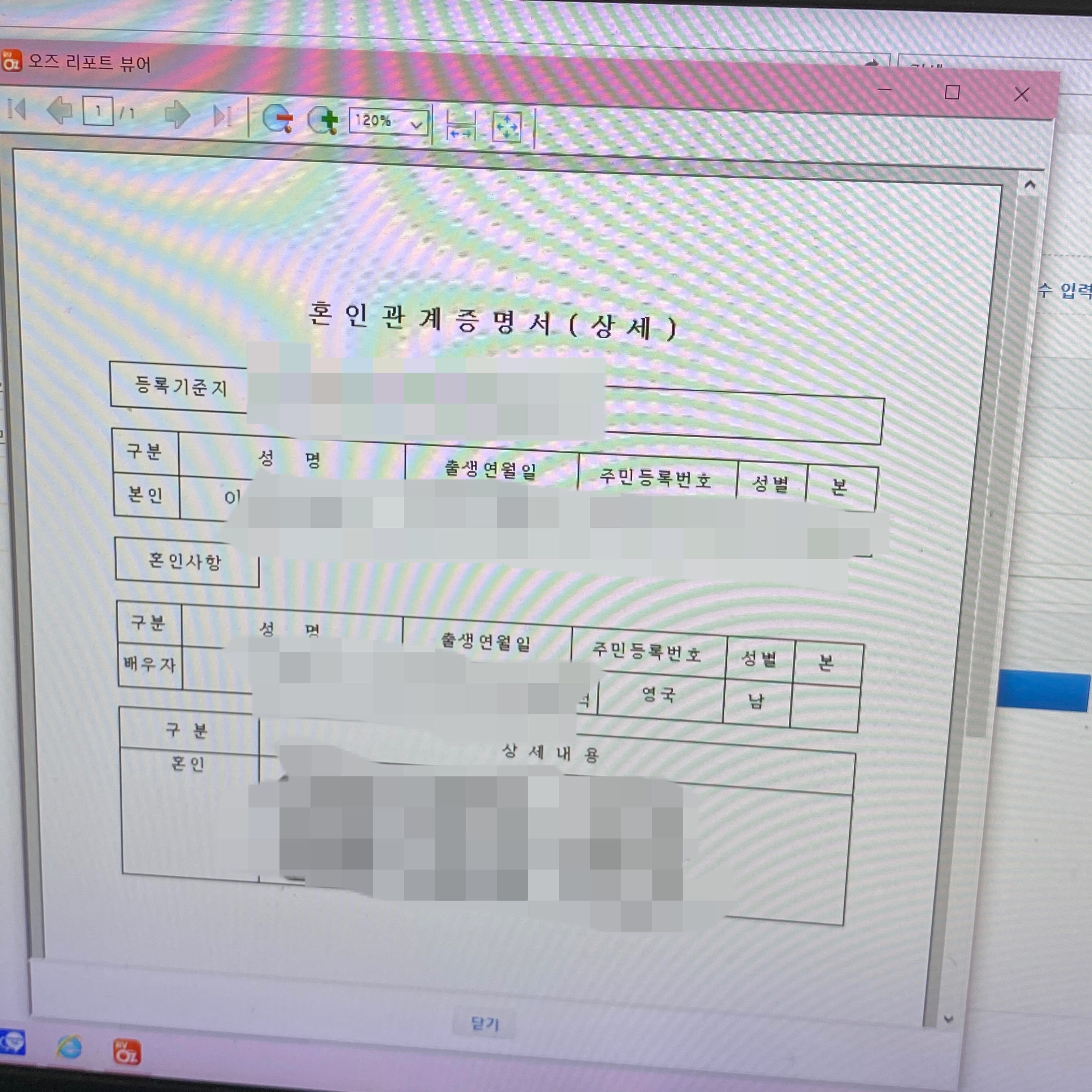 - 혼인신고서 원본과 영국 공증사에게 받은 서명 공증이 묶인 서류 묶음